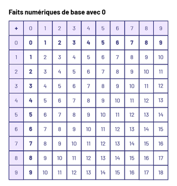 image La grille chiffrée s’intitule Faits numériques de base avec zéro.Dans le coin en haut à gauche, il y a le symbole plus. Les colonnes et les rangées se chiffrent respectivement de zéro à neuf. La rangée et la colonne zéro se chiffrent de zéro à neuf. La rangée et la colonne un se chiffrent d’un à dix. La rangée et la colonne deux se chiffrent de deux à onze. La rangée et la colonne trois se chiffrent de trois à douze. La rangée et la colonne quatre se chiffrent de quatre à treize. La rangée et la colonne cinq se chiffrent de cinq à 14. La rangée et la colonne six se chiffrent de six à 15. La rangée et la colonne sept se chiffrent de sept à 16. La rangée et la colonne huit se chiffrent de huit à 17. Et la rangée et la colonne neuf se chiffrent de neuf à 18.