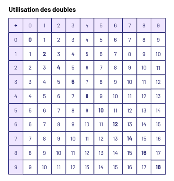 image La grille chiffrée s’intitule Utilisation des doubles. Dans le coin en haut à gauche, il y a le symbole plus. Les colonnes et les rangées se chiffrent respectivement de zéro à neuf. La rangée et la colonne zéro se chiffrent de zéro à neuf. La rangée et la colonne un se chiffrent d’un à dix. La rangée et la colonne deux se chiffrent de deux à onze. La rangée et la colonne trois se chiffrent de trois à douze. La rangée et la colonne quatre se chiffrent de quatre à treize. La rangée et la colonne cinq se chiffrent de cinq à 14. La rangée et la colonne six se chiffrent de six à 15. La rangée et la colonne sept se chiffrent de sept à 16. La rangée et la colonne huit se chiffrent de huit à 17. Et la rangée et la colonne neuf se chiffrent de neuf à 18.
