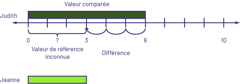 - Comparaison : Valeur de référence inconnue. Judith a 6 $ et Jeanne a 3 $ de moins que Judith. Combien de dollars Jeanne a-t-elle? OU Jeanne a 3 $ de moins que Judith. Judith a 6 $. Combien de dollars Jeanne a-t-elle?