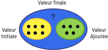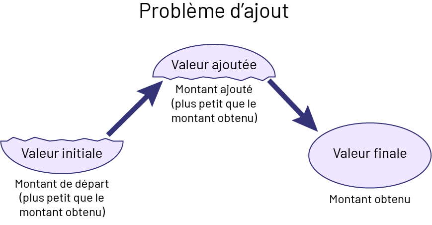 image Problème d’ajout. L’image montre un ovale brisé en deux sur le sens de la longueur et un ovale intact. À gauche, on trouve la partie inférieure de l’ovale, nommée Valeur initiale. En dessous, il est écrit : « Montant de départ, plus petit que le montant obtenu ». Une flèche pointe vers la moitié supérieure de l’ovale brisé, nommée Valeur ajoutée. En dessous, il est écrit : « Montant ajouté, plus petit que le montant obtenu ». Une flèche pointe vers l’ovale entier, nommé Valeur finale. En dessous, il est écrit : « Montant obtenu ».