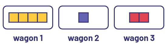 Image Trois rectangles blancs de grosseur identique sont alignés. Ils se nomment respectivement wagon un, wagon deux et wagon trois. Dans le rectangle wagon un, il y a quatre unités jaunes. Dans le rectangle wagon deux, il y a une unité bleue. Et dans le rectangle wagon trois, il y a deux unités rouges.