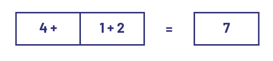 Image L’image contient trois rectangles blancs de la même grosseur alignés côte à côte. Les deux premiers sont collés ensemble, il y a un symbole « égal », puis il y a le troisième rectangle blanc. Dans le premier rectangle, il est écrit « quatre plus ». Dans le deuxième rectangle, il est écrit « un plus deux ». Vient le symbole « égal », puis dans le troisième rectangle, il est écrit « sept ».