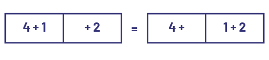 Image L’image contient quatre rectangles blancs de la même grosseur alignés côte à côte. Les deux premiers sont collés ensemble, il y a un symbole « égal », puis le troisième et le quatrième rectangle sont collés ensemble. Dans le premier rectangle, il est écrit « quatre plus un ». Dans le deuxième rectangle, il est écrit « plus deux ». Vient le symbole « égal », puis dans le troisième rectangle, il est écrit « quatre plus », et dans le quatrième rectangle, il est écrit « un plus deux ».