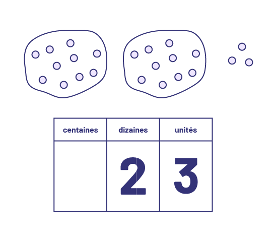 L’image montre deux dizaines de jetons regroupées par un cercle, et trois jetons hors des deux cercles. Sous les jetons, il y a un tableau séparé en trois : centaines, qui est vide, dizaines, qui contient le chiffre deux, et unités, qui contient le chiffre trois.