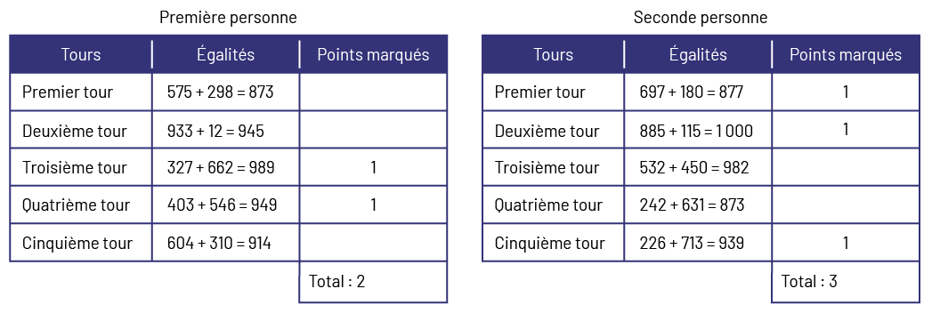 - détermine la personne qui a la somme la plus près de 1 000; cette dernière marque un point;
