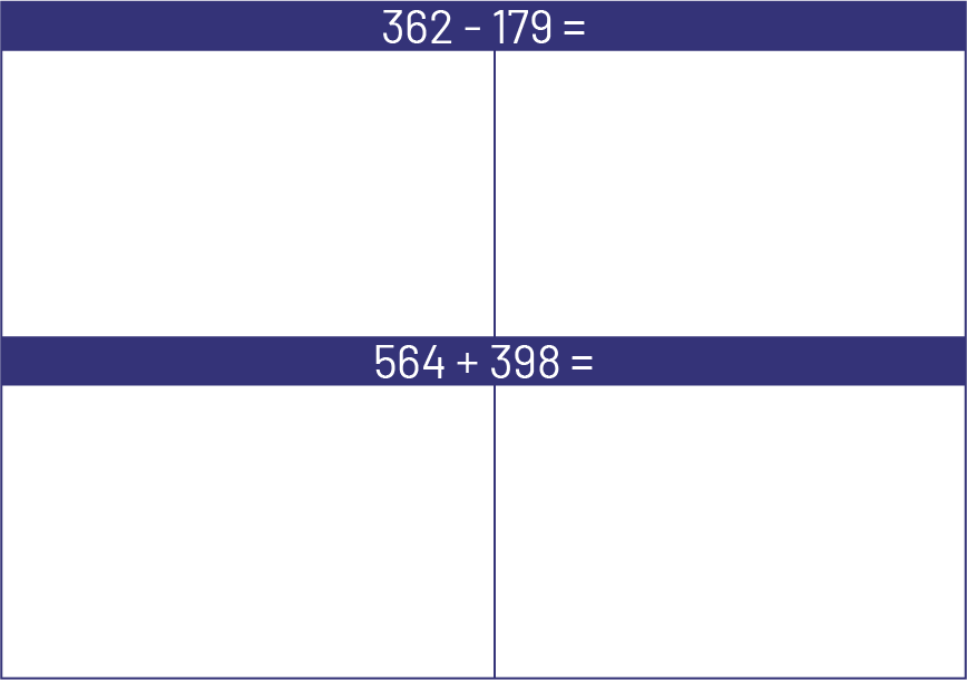 Image Un tableau où les élève peuvent laisser une trace de leur démarche.Dans la premier partie du tableau, il y a une soustraction :362 moins 179 égal.Suivies de 2 cases vides.Deuxième partie du tableau, une addition :564 plus 398 égal.Suivie de 2 cases vides.