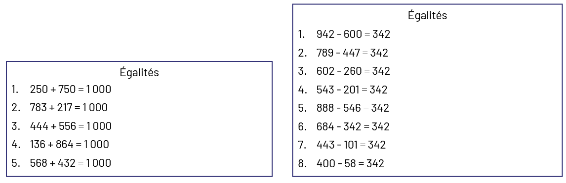 136 plus 864 égal 1000. 568 plus 432 égal 1000. Tableau qui représente des égalités. 942 moins 600 égale 342. 789 moins 447 égal 342. 602 moins 260 égal 342. 543