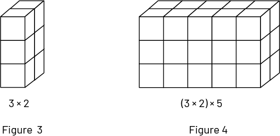 On peut aussi considérer la figure 3, qui illustre 3 étages de 2 cubes, soit \(3 \times 2\) cubes. La figure 4 peut alors représenter \(3 \times 2\) cubes qui paraissent 5 fois, soit \((3 \times 2) \times 5\).