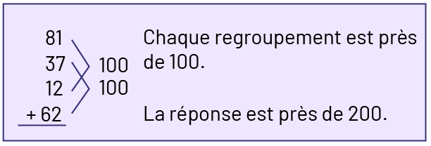 Image Encadré qui donne un exemple de regroupement. Une addition verticale : 81 plus 37, plus 12,