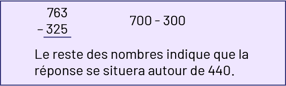 763 moins 325 égal. On soustraie les centaines, 700 moins 300. Le reste des nombres indique que la réponse se situera