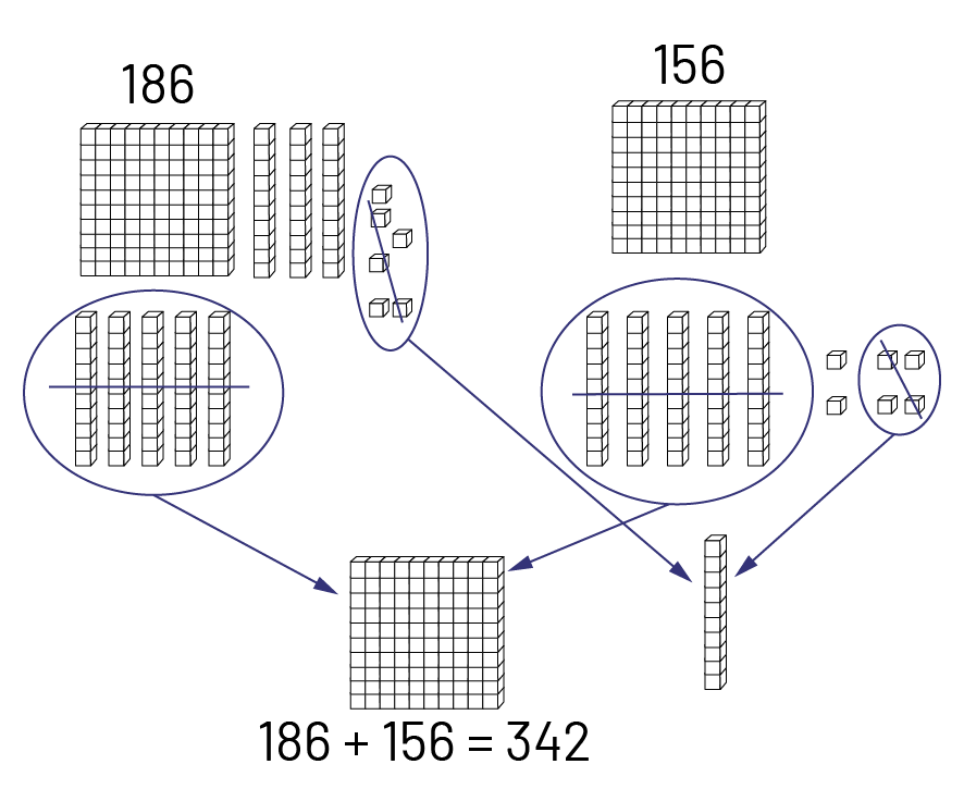 Image L’addition, 186 plus 156 égal 342, est représentée avec des blocs. 186 : un bloc de