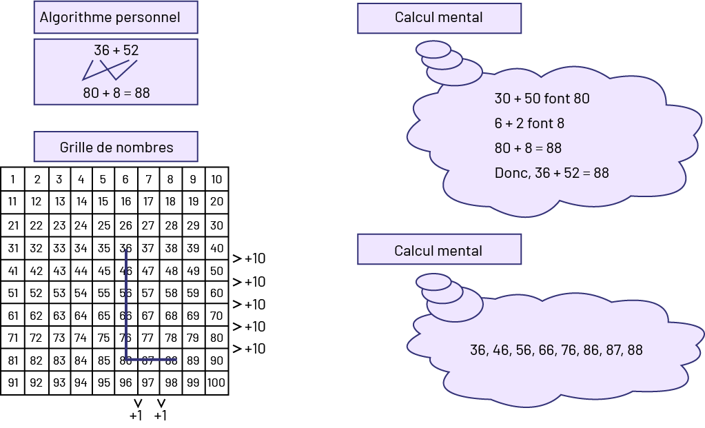L’exploration de stratégies (incluant les algorithmes personnels) est essentielle puisque celles-ci sont des exemples tangibles du sens du nombre et du sens des opérations que les élèves ont acquis. Ces stratégies et ces algorithmes personnels indiquent comment elles et ils « jouent » avec les nombres et les opérations. Ces stratégies qui sont mises sur papier ont le potentiel de se transposer en stratégies de calcul mental. Par exemple, les élèves qui ont l’occasion d’écrire leur raisonnement sur papier ou qui utilisent une grille de nombres pour effectuer un calcul tel que \(36 + 52\) pourront ultérieurement suivre un raisonnement similaire mentalement.