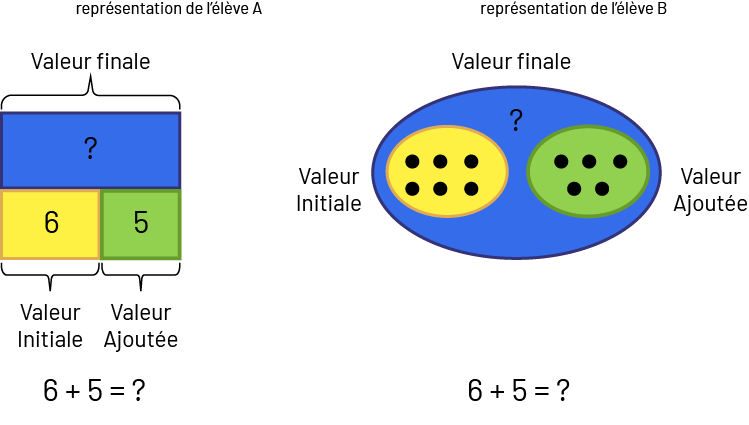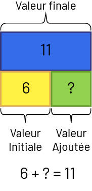 d’une valeur de 5. Le 6 est la valeur initiale et le 5 la valeur ajoutée. 6 plus 5 égal inconnue. Représentation de