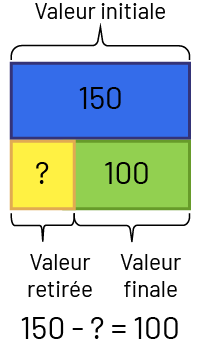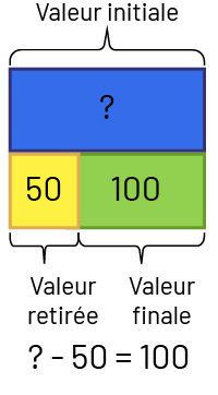 Et un bloc vert de valeur 100, c’est la valeur finale. 150 moins inconnue égal 100.
