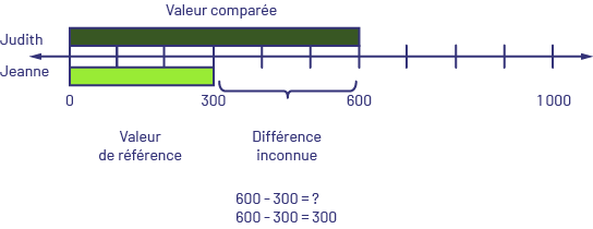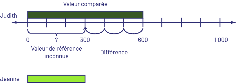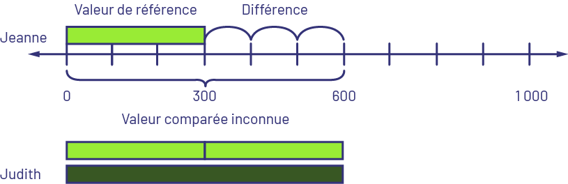 Image Une droite numérique de zéro à 1000, par intervalles réguliers de 100. Une barre verte kaki représente le montant de Judith, de zéro à 600, c’est la valeur comparée. Une parenthèse commence à zéro et finie à 300, c’est la valeur de référence inconnue. Des bonds de 100 de 300 à 600 représentent la différence. Une barre verte pâle représente le montant de Jeanne.