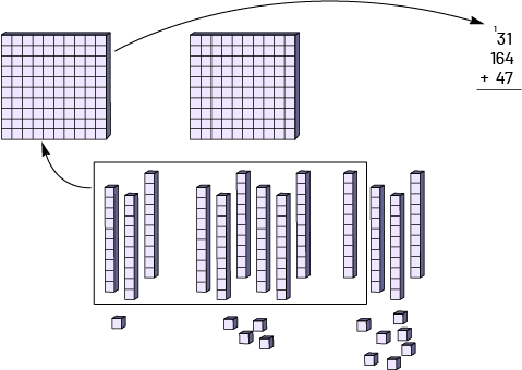 Image 31 plus 164 plus 47 égal. 2 blocs de centaines, 13 blocs de dizaines et 12 blocs d’unités. Dix blocs de dizaine sont encerclés. Une flèche pointe du cercle vers un bloc de centaine, et une autre flèche pointe du bloc de centaine vers l’addition.