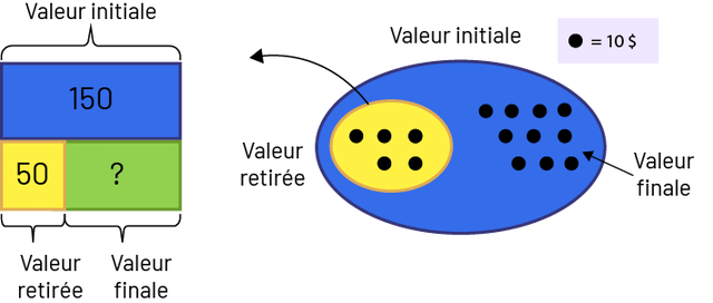 Le modèle partie-tout peut être utile pour représenter les valeurs connues et inconnues dans des problèmes de retrait. Le modèle d’ensemble est utile pour représenter le retrait d’une quantité.