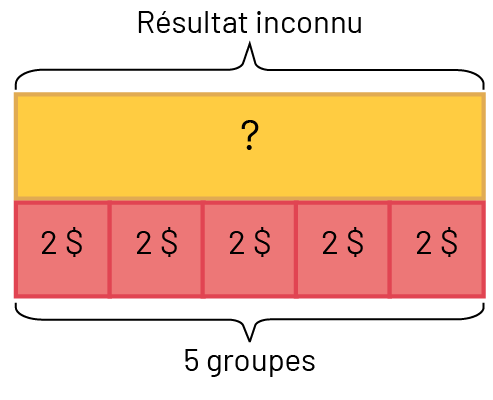 Ce sont des problèmes qui impliquent des ensembles de quantité égale. Avec ces problèmes, il y a un groupe d’une taille donnée, qui est répété un certain nombre de fois pour arriver à un résultat. Parfois, la taille de chaque groupe est inconnue, parfois le nombre de groupes est inconnu et parfois le résultat est inconnu.