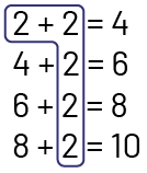 6. 6 plus 2 égal 8. 8 plus 2 égal dix. Tous les 2 sont encerclés pour créer un ensemble. Le commentaire suivant