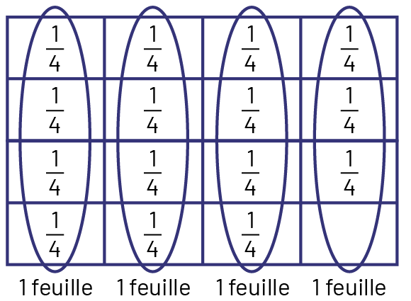Je sais qu’il y a quatre \(\frac{1}{4} \) dans une feuille de papier. J’encercle quatre \(\frac{1}{4} \), ce qui me donne une pleine feuille de papier.