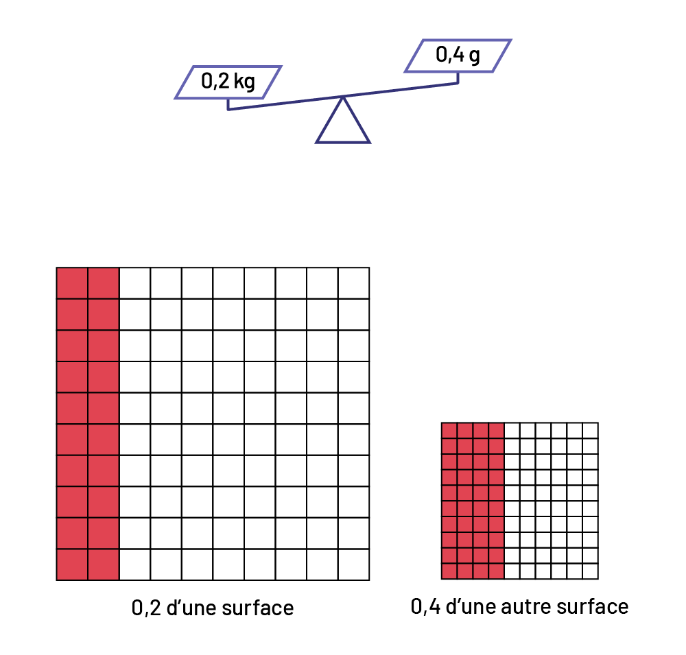 Dans ces exemples, même si le nombre 0,2 est inférieur au nombre 0,4 (\(0,2 < 0,4\)), 0,2 kg est une masse plus grande que 0,4 g, tout comme 0,2 du gros carré est une surface plus grande que 0,4 du petit carré.