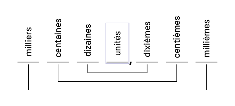Grille de positionnement des nombres. De gauche à droite: milliers, centaines, dizaines, unités, dixièmes, centièmes,