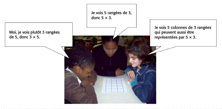 »L’élève 3 dit : « Je vois 5 colonnes de 3 rangées qui peuvent aussi être représentées par 5 multipliées par