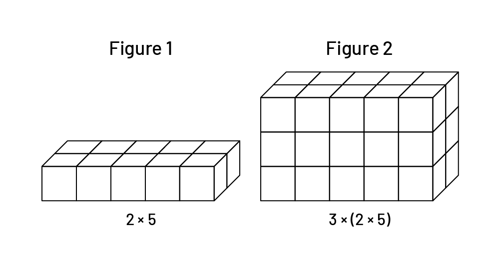 Dans la figure 1, on voit qu’il y a 2 rangées de 5 cubes, soit \(2\; \times \;5\) cubes. Dans la figure 2, on voit 3 étages contenant chacun \(2\; \times \;5\) cubes. La figure représente donc \(3\; \times \;(2\; \times \;5)\) cubes.