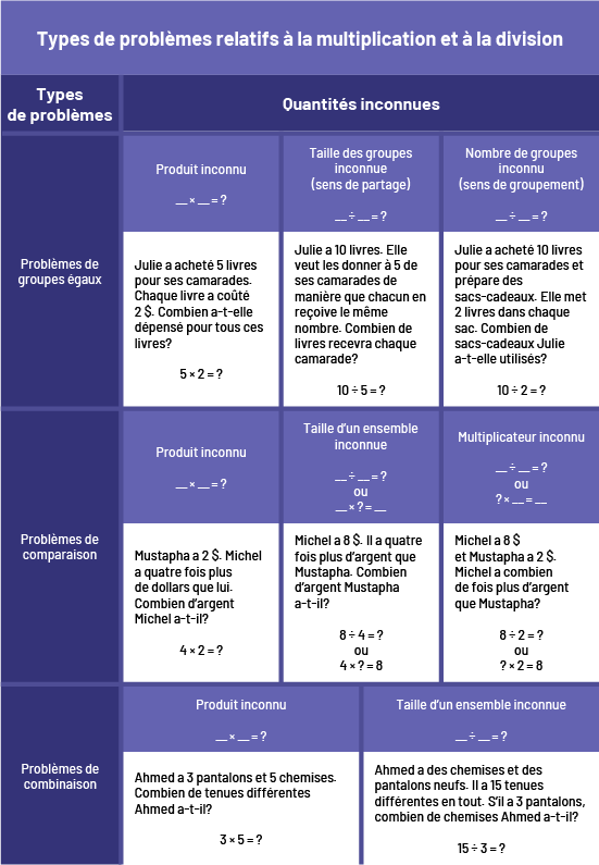 Il est essentiel de traiter des deux types de problèmes, puisqu’ils sont la base de l’intégration d’autres concepts mathématiques. Il n’est pas nécessaire que les élèves sachent le nom des types de problèmes, mais il est essentiel qu’elles et ils aient l’occasion d’en résoudre de divers types, tout en employant une variété de stratégies.