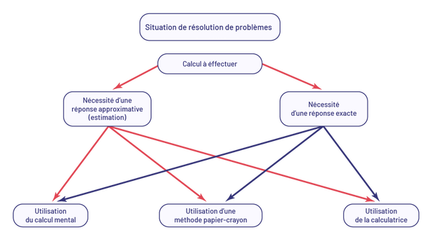 Que ce soit un problème comportant une opération ou plus d’une opération, les élèves doivent prendre des décisions et faire des choix en fonction du contexte. Une approche axée sur la résolution de problèmes les initiera à cette réflexion. Devant un problème, il faut d’abord l’analyser afin d’en déterminer les données et de comprendre qu’un calcul doit être effectué. Ensuite, il faut savoir, selon le contexte, si on cherche une réponse approximative ou une réponse exacte. Dans les deux cas, selon le contexte et les nombres en cause, il faut ensuite déterminer si le calcul sera effectué mentalement, par écrit ou à l’aide d’une calculatrice. Enfin, le calcul désiré est effectué.