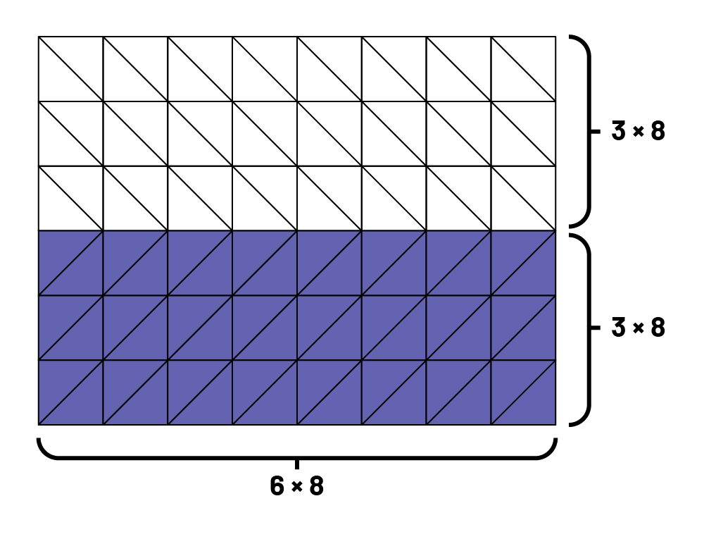 Supposons que l’élève ne peut pas se rappeler un fait numérique donné qui ne comprend que des facteurs pairs. Une méthode de rechange consiste à prendre la moitié de l’un des facteurs pour trouver le produit et ensuite à doubler ce produit. Par exemple, s’il est difficile de se rappeler ce que font \(6\; \times \;8\), il suffit de prendre la moitié de l’un des facteurs \(\left( {3\; \times \;8\; = \;24} \right)\) et de doubler le produit \(\left( {2\; \times \;24} \right)\) pour arriver à la réponse, soit 48. Les élèves devraient explorer cette stratégie en utilisant des dispositions rectangulaires leur offrant une représentation visuelle. Parfois, ces stratégies peuvent sembler un peu lourdes, mais elles offrent aux élèves une façon d’arriver à la bonne réponse par le raisonnement en partant de faits connus. (Van de Walle et Folk, 2005, p. 152, traduction libre)