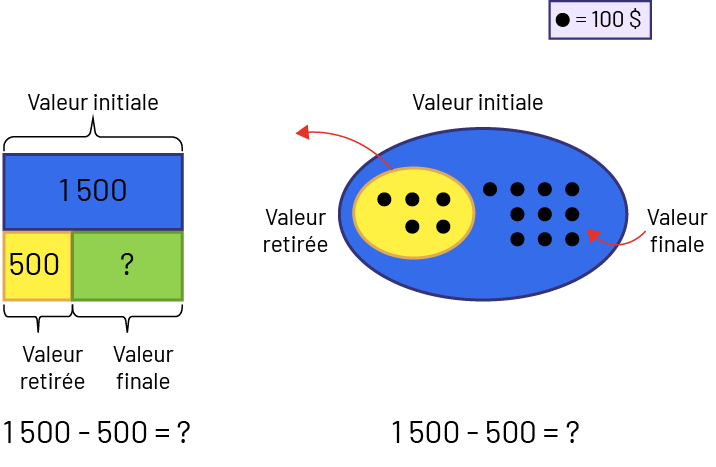 - Retrait : Valeur finale inconnue – Nadia a 1 500 $. Elle donne 500 $ à son frère. Combien lui reste-t-il de dollars à présent?