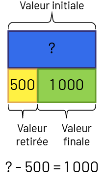 un:1500 moins 500 égal point d’interrogation.Un rectangle bleu identifié avec le nombre 1500 au-dessus duquel un