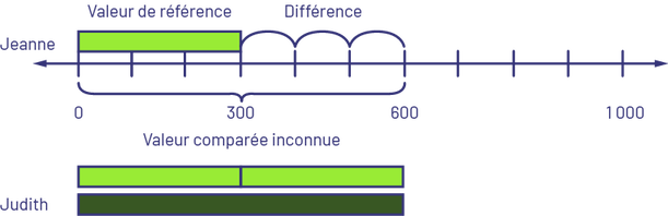 - Comparaison : Valeur de référence inconnue – Judith a 600 $ et Jeanne a 300 $ de moins que Judith. Combien de dollars Jeanne a-t-elle? ou Jeanne a 300 $ de moins que Judith. Judith a 600 $. Combien de dollars Jeanne a-t-elle?