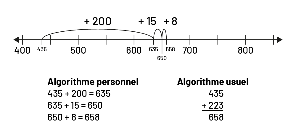 Les algorithmes usuels commencent habituellement par la droite, alors que dans leurs algorithmes personnels, les élèves commencent souvent par la gauche, ce qui leur permet de maintenir un sens de la grandeur des quantités en cause. Puisqu’un algorithme personnel est le fruit de l’imagination et de la compréhension de chaque élève, il demeure très souple, de manière qu’il puisse servir dans diverses situations.