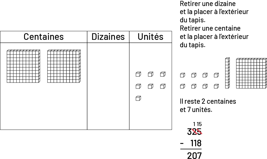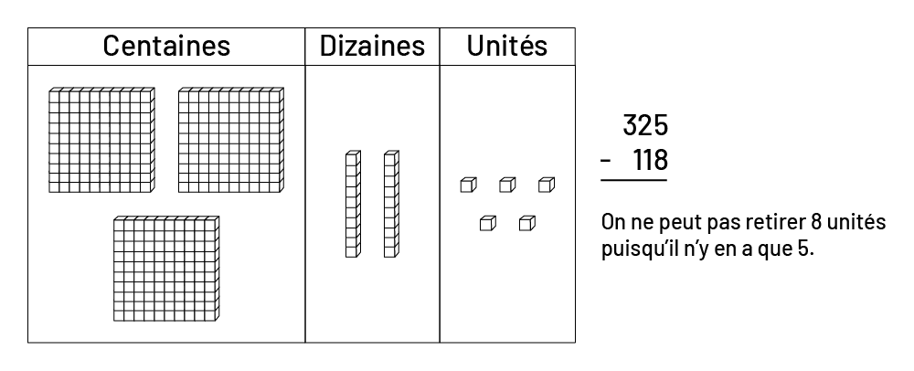 Il faut prêter une attention particulière aux soustractions portant sur des nombres comportant un 0 à la position des unités ou des dizaines. Van de Walle et Folk (2005, p. 193) suggèrent qu’il est plus efficace d’aborder cette problématique lorsque les élèves travaillent avec le matériel de manipulation. Il importe de donner aux élèves l’occasion de discuter des différentes stratégies utilisées pour effectuer des soustractions avec de tels nombres.