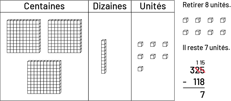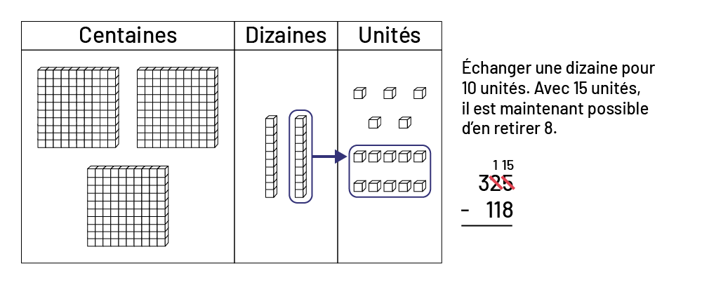 Lorsqu’elles et ils utilisent du matériel concret pour représenter une soustraction, les élèves peuvent réellement manipuler les quantités. Pour déterminer une différence, les élèves peuvent comparer une quantité à une autre ou retirer une quantité d’une autre. En outre, les élèves découvrent, en utilisant ce matériel, qu’il est parfois nécessaire d’effectuer des échanges pour pouvoir déterminer plus facilement la différence entre les quantités.