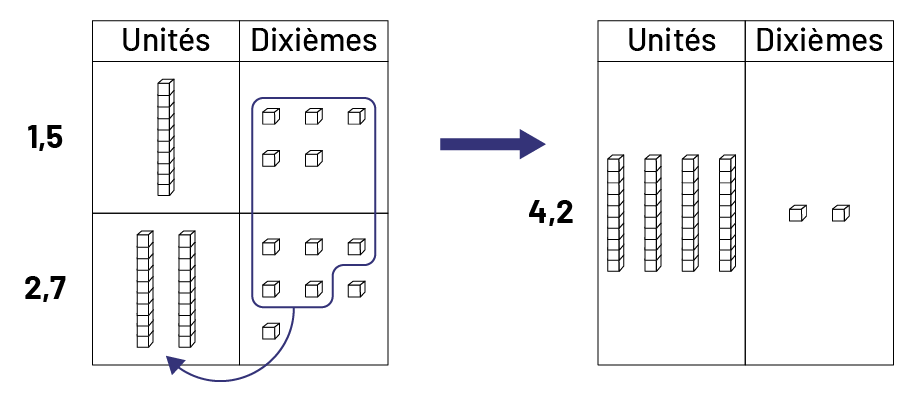 Pour additionner les deux quantités, on représente chacun des deux nombres à l’aide de matériel de base dix sur un tapis de valeur de position. En réunissant le matériel, on obtient 3 unités et 12 dixièmes. On regroupe 10 dixièmes qu’on échange contre 1 unité. On a alors 4 unités et 2 dixièmes, soit 4,2.