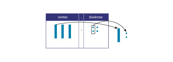 pointe la colonne des dixièmes un ensemble de dix unités encerclées. Dans la colonne des dixièmes, les 4 cubes