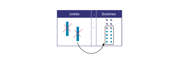 unités et 4 cubes dans la colonne des dixièmes. Les 2 bâtonnets sont barrés et une flèche partant de cette direction