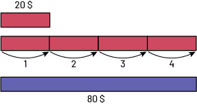 image Une petite réglette rouge représentant 20 dollars.En dessous il y a 4 petites réglettes rouges collées les unes à la suite des autres et chacune ayant une flèche partant de sa direction et allant vers la réglette à sa droite indiquant que l’on passe de, une à 4 réglettes.Dessous il y a une grosse réglette mauve aussi longue que les 4 réglettes rouges du dessus. Cette réglette est intitulée: 80 dollars.