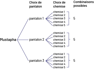 image Diagramme en arbre de Mustapha.De gauche à droite, les branches sont:Choix de pantalon, choix de chemise et combinaisons possibles.Sous la branche pantalon, il y a 3 possibilités: pantalon un, pantalon 2 ou pantalon 3.Sous la branche choix de chemise, i y a 5 choix possibles pour chaque choix de pantalon soit:Chemise un, chemise 2, chemise 3, chemise 4 et chemise 5.Sous la branche combinaisons possibles, un crochet réunion les 5 choix de chemises pour chaque choix de pantalons indiquant qu’il y a 5 combinaisons possibles par choix de pantalon.5 plus 5 plus 5 égal 15 ou 3 fois 5 égal 15.