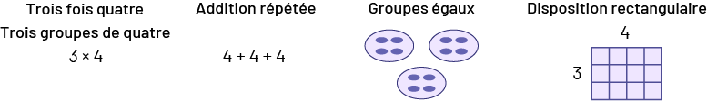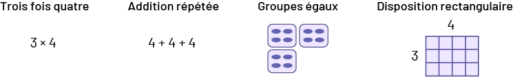 image Image un:Trois fois 4Trois groupes de quatre 3 fois 4Image 2:Addition répétée4 Plus 4 plus 4Image 3: Groupes égaux3 ensembles 4 pointsImage 4:Disposition rectangulaireUn bout de papier quadrillé ayant 4 colonnes et de large et 3 lignes de haut. Le chiffre 4 est indiqué au haut du papier et le chiffre 3 est indiqué à droite du papier.
