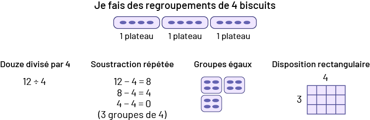 image Image un: Je fais des regroupements de 4 biscuits.On peut voir 3 ensembles de 4 biscuits et l’inscription “ un plateau ” est écrite sous chaque ensemble.Image 2:Douze divisé par quatre.12 divisé par 4.Image 3:Soustraction répétée12 moins 4 égal 88 moins 4 égal 44 moins 4 égal zéro(Parenthèse ouvrante)3 groupes de 4 (parenthèse fermante)Image 4: Groupes égaux3 ensembles de 4 biscuitsImage 5:Disposition rectangulaireUn bout de papier quadrillé ayant 4 colonnes et de large et 3 lignes de haut. Le chiffre 4 est indiqué au haut du papier et le chiffre 3 est indiqué à droite du papier.