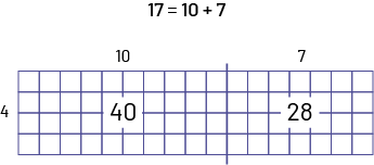 image Papier quadrillé de 4 rangées de 17 petits carrés.17 égal dix plus 7.4 est inscrit à gauche du papier.Dix est inscrit au-dessus du papier vis-à-vis des dix premiers carrés et 7 est inscrit au-dessus du papier plus à droite.Le nombre 40 est indiqué au centre des dix premières colonnes.Le nombre 28 est indiqué au centre des 7 dernières colonnes.
