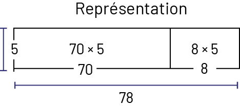 image Disposition rectangulaireReprésentation.Rectangle divisé en 2 colonnes.Le chiffre 5 désignant la hauteur du rectangle est indiqué à gauche.Le nombre 70 désignant la largeur de la première colonne est indiqué sous le rectangle.Le chiffre 8 désignant la largeur de la deuxième colonne est indiqué sous le rectangle.Le nombre 78 désigne la largeur intégrale du rectangle.À l’intérieur de la première colonne:70 fois 5.À l’intérieur de la deuxième colonne: 8 fois 5.