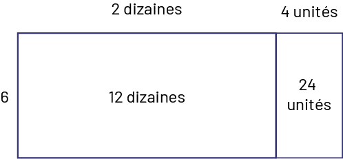 image Disposition rectangulaire de 2 colonnes.À gauche du rectangle le chiffre 6.Au-dessus de la première colonne du rectangle, sont indiquées 2 dizaines. Au-dessus de la deuxième colonne du rectangle, sont indiquées 4 unités.À l’intérieur du rectangle dans la première colonne se trouve le résultat de la multiplication de ce qui est écrit à gauche par ce qui est écrit en haut, soit 12 dizaines.Dans la deuxième colonne du rectangle, il est indiqué 24 unités, soit le résultat de la multiplication de ce qui est écrit à gauche par ce qui est écrit au-dessus.