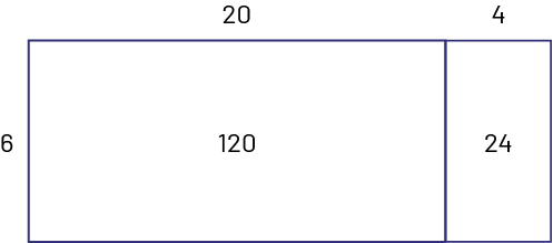 image Disposition rectangulaire de 2 colonnes.À gauche du rectangle le chiffre 6.Au-dessus de la première colonne du rectangle est indiqué 20. Au-dessus de la deuxième colonne du rectangle est indiqué 4.À l’intérieur du rectangle dans la première colonne se trouve le résultat de la multiplication de ce qui est écrit à gauche par ce qui est écrit en haut, soit 120.Dans la deuxième colonne du rectangle, il est indiqué 24, soit le résultat de la multiplication de ce qui est écrit à gauche par ce qui est écrit au-dessus.