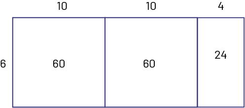 image Disposition rectangulaire de 3 colonnes.À gauche du rectangle le chiffre 6.Au-dessus de la première colonne du rectangle est indiqué dix. Au-dessus de la deuxième colonne du rectangle est indiqué dix. Au-dessus de la troisième colonne est indiqué 4.À l’intérieur du rectangle dans la première colonne se trouve le résultat de la multiplication de ce qui est écrit à gauche par ce qui est écrit en haut, soit 60.Dans la deuxième colonne du rectangle, il est indiqué 60, soit le résultat de la multiplication de ce qui est écrit à gauche par ce qui est écrit au-dessus.Dans la troisième colonne, il est indiqué 24.