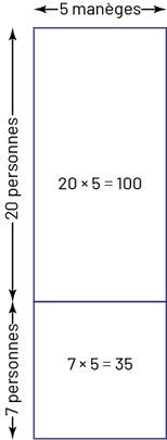 image Disposition rectangulaire d'une colonne et de 2 lignes.Au-dessus du rectangle est inscrit “ 5 manèges ”.À gauche vis-à-vis la première ligne est inscrite “ 20 personnes ”.À gauche vis-à-vis la deuxième ligne est inscrite: “7 personnes”.Dans la première case à l’intérieur du rectangle est inscrit:20 fois 5 égal 100.Dans la deuxième case à l’intérieur du rectangle est inscrit:7 fois 5 égal 35.